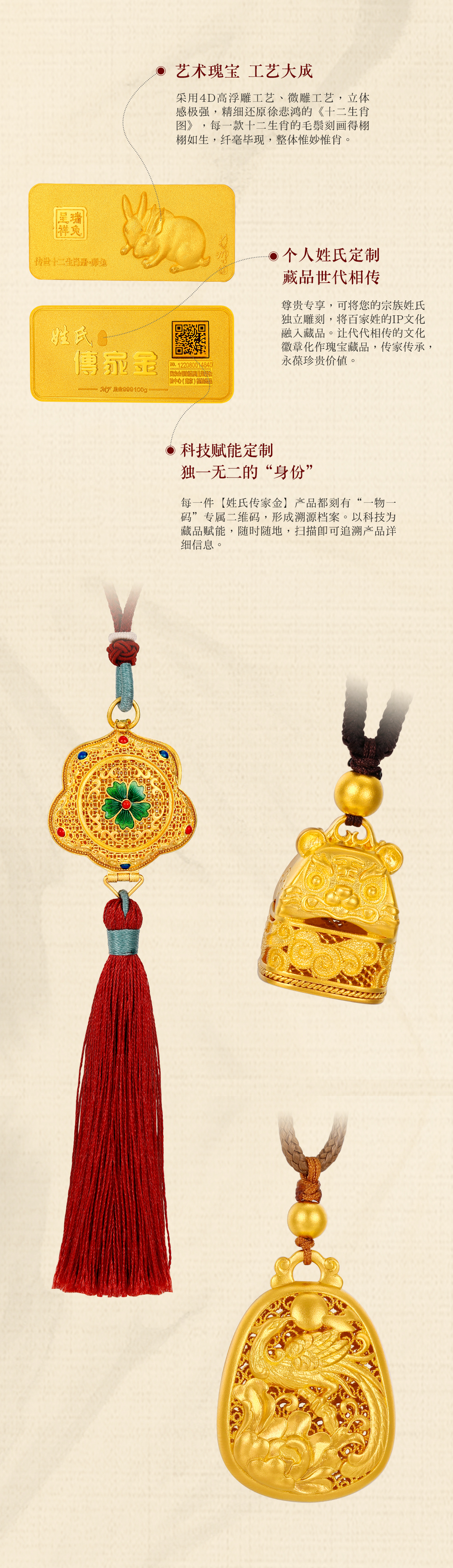 随着中国在国际地位上的提升,中国人的文化自信不断高涨,国民对于中华传统文化具有更强烈的认同感和自豪感。明丰珠宝【姓氏传家金】系列的创作团队,基于此种市场趋势,汲取传统文化,几易其稿,经过不懈努力,创作出了此套具有中国姓氏文化内涵的金条传家藏品——【姓氏传家金】系列。